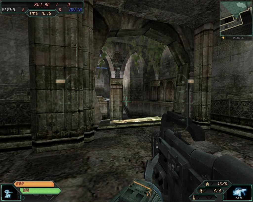 「メルデス」は荘厳な雰囲気を残すかつてのマス王国王城と、その地下にある先端科学研究所を舞台とした、複雑な地形が特徴マップです。プレイヤーは防御シールドに守られたマス王城の秘密をめぐり激しい戦いが繰り広げます。「メルデス」では「デスマッチ」「チームデスマッチ」「オペレーション」の3モードがプレイ可能です。防御シールドの破壊と防衛が勝負の鍵を握る、「メルデス」オペレーションをお楽しみください。
