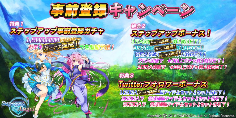 ゲームの企画・開発・運営事業を展開するDMM GAMESと、デジタルコンテンツの企画・開発及び運営を行う株式会社タムタムは今秋リリスー予定の『シュプリームエンジェル』のリリース日を2016年11月1日11時に決定致しました。事前登録は、10月31日15時に終了しますので、この機会に是非ご登録下さい。