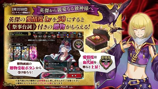 2月14日(火)に入界(ログイン)すると、お伽番の英傑から「本命の贈物」をもらえる。