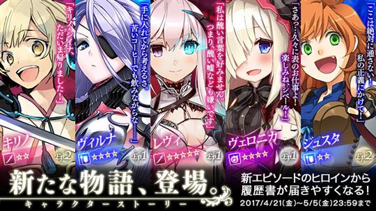 4月21日(金)メンテナンス後から5月5日(金)23:59まで、キャラクターストーリーに新しくエピソードが追加された社員5人からの履歴書が届きやすくなります。
