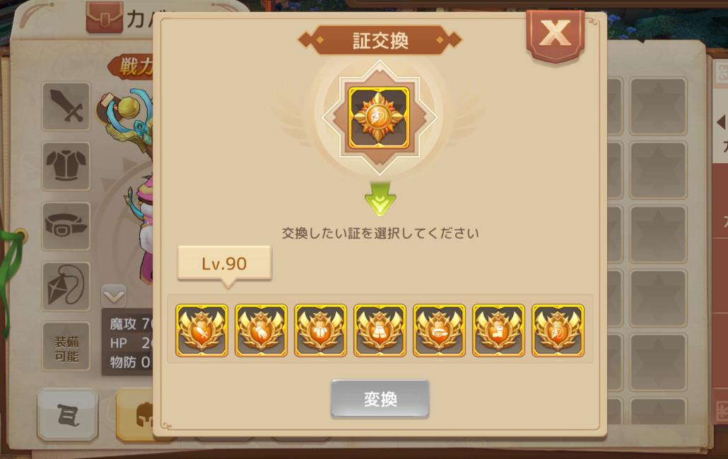 「装備の証変換機能」では、本職業のLv95装備の証を、任意の職業のLv90装備の証へ変換することができる。